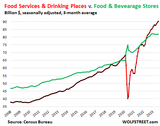 Our drunken sailors love “experiences,” and they are now spending a lot more eating out and drinking out (red in the chart below) than they’re spending at food and beverage stores (green).
