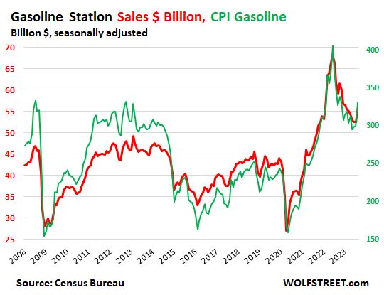 Sales at gas stations move in lockstep with the price of gasoline. But sales at gas stations account for only 8% of total retail sales. Sales jumped 5.3% in August from July. But year-over-year, sales were still down 10.3%.