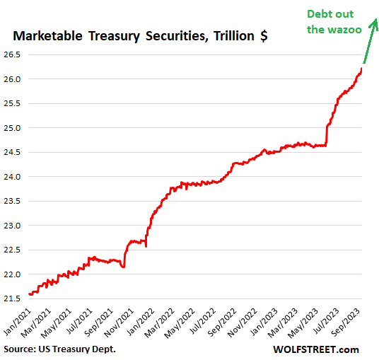 Marketable securities outstanding have spiked by $1.51 trillion since the debt ceiling was lifted on June 2, a huge amount of additional issuance in three-and-a-half months, and by $1.9 trillion year-over-year.