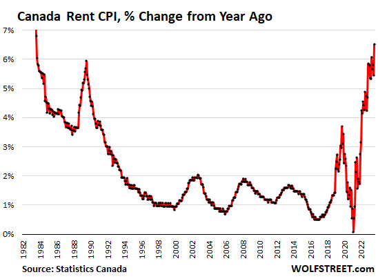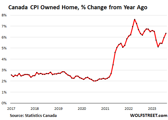 With inflation resurging, while economic growth fizzled, the BoC left its overnight rate unchanged at 5.0% at the last meeting on September 6. With an eye on inflation, it added a clear bias for further tightening: The BoC “remains concerned about the persistence of underlying inflationary pressures, and is prepared to increase the policy interest rate further if needed,” it said in the statement. It has been mentioning the housing market as a source of concern. So it now has a lot more reasons to be frazzled about the housing market and how it fuels inflation.