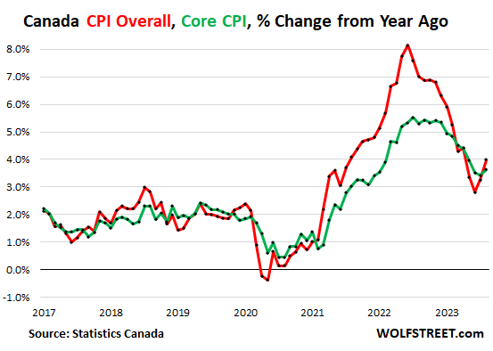 In a nasty big surprise of the type that inflation, once it’s running loose, likes to dish out, the Consumer Price Index in Canada re-accelerated in August for the second month in a row, to 4.0% year-over-year, according to Statistics Canada today, up from 3.3% in July, and 2.8% in June (red line in the chart below). As everywhere, part of it was the jump in gasoline prices. But that’s just a convenient side story.