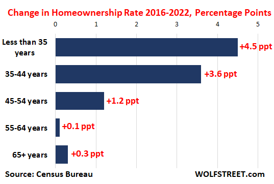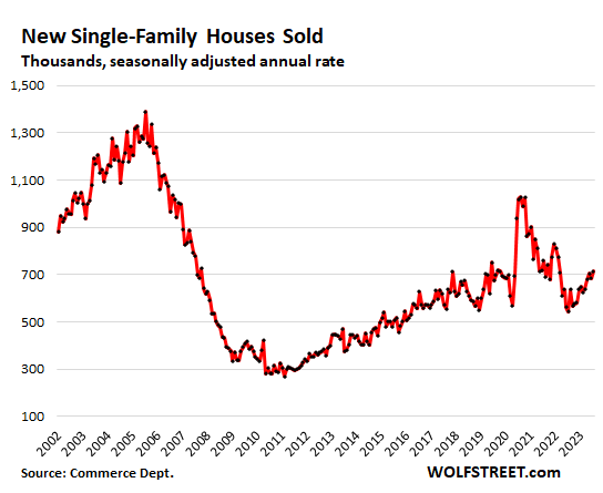 Demand and supply have vanished in equal measure because the homeowners with a 3% mortgage are not buying a new home, so they have vanished as buyers; and they’re therefore not listing their current home, and so they have also vanished as sellers. This phenomenon caused the entire housing market – buyers and sellers – to shrink by about 20%, I estimated here.