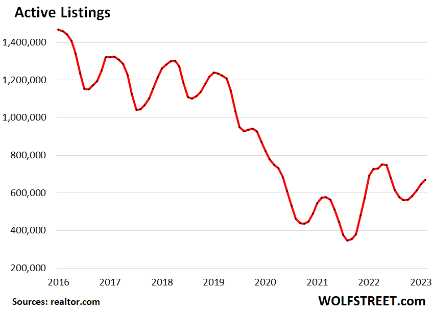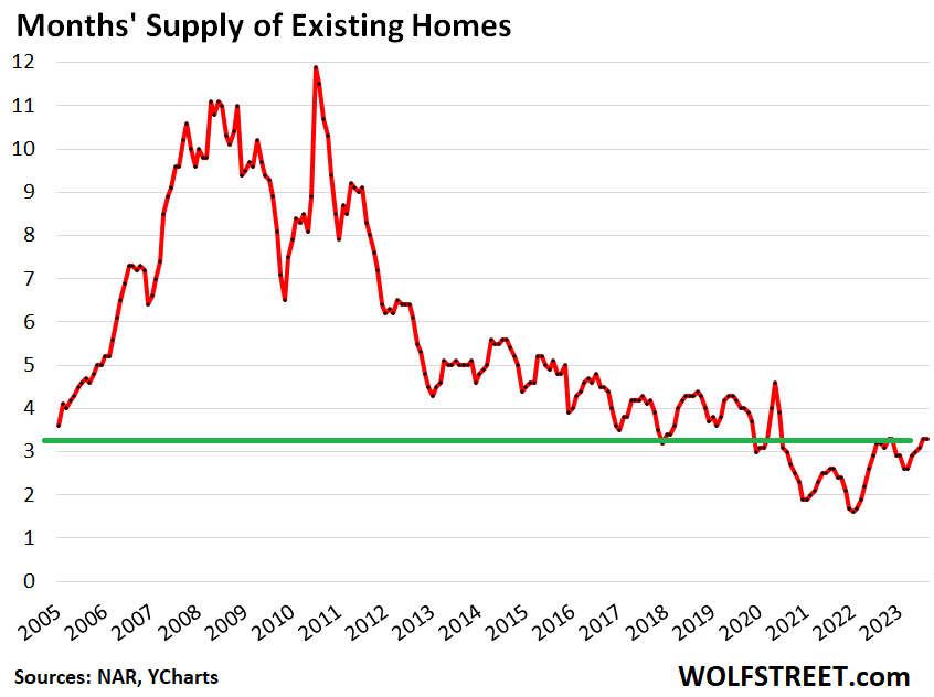 Inventories have been declining ever since 2007. The reason is how technological innovation in RE has hit “inventory” the way inventory is defined: A home enters inventory when it is initially listed for sale in the MLS, and it exits inventory when the sale closes or when the home is pulled off the market. The time it takes to do all the processes from marketing the home to getting a mortgage approved, shuffling documents around, and closing the sale determine how long a home sits in “inventory.” Technology has dramatically shrunk the time it takes to do all this, and so homes spent less time in inventory waiting for these processes to happen, and because each home spent less time in inventory, overall inventory drops. So inventory shrank year after year for 15 years because the processes sped up. This is a crucial concept; my detailed discussion is here.