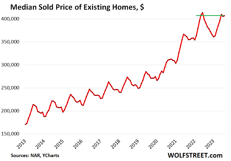 Let’s start with the median price, which in August was $407,100, roughly flat with a month ago, but that month-ago figure was revised down today by $1,000, and after that downward revision, today’s price ticked up by a hair. Due to the plunge in July and August 2022, the median price was up 3.9% year-over-year. From the peak in June 2022, the median price was down 1.6% (historic data via YCharts):