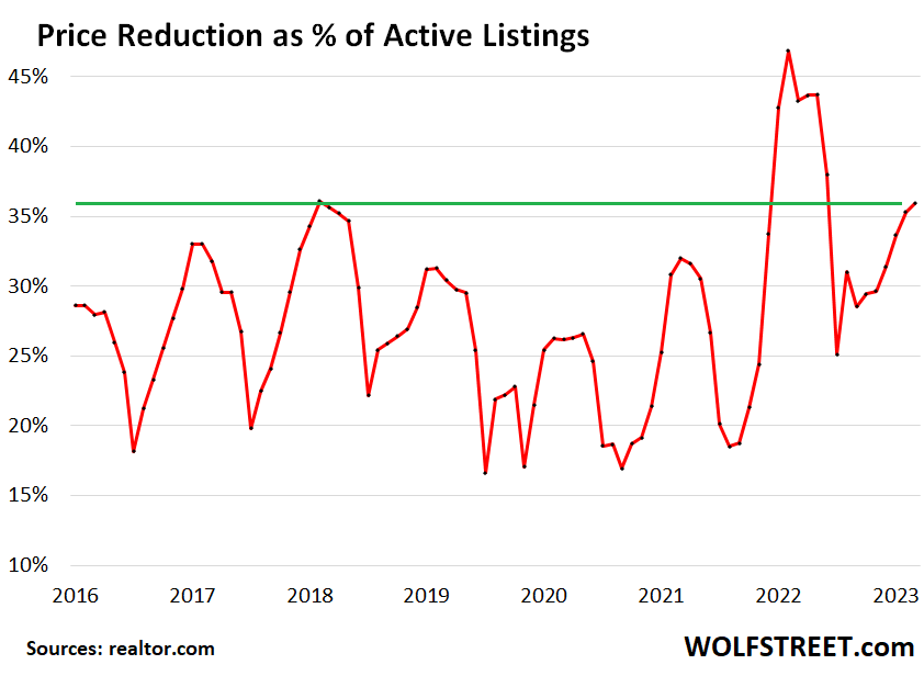 Price reductions as a percent of active listings jumped to 35.9%, which about matched the pre-pandemic high in July 2018, as sellers are getting more motivated to sell their homes. Lower the price, and they will come (data via realtor.com):