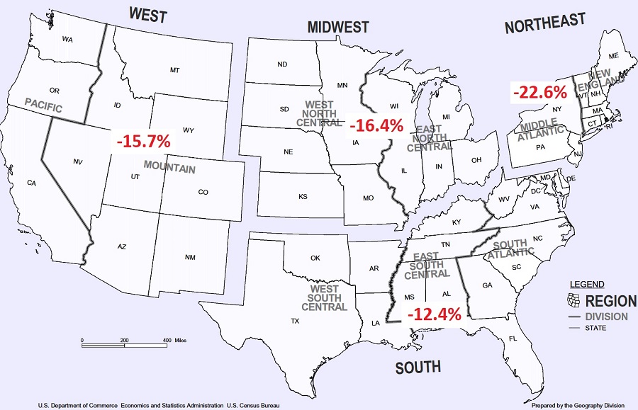 By region, year-over-year sales plunged in all regions from the already beaten-down levels last year: