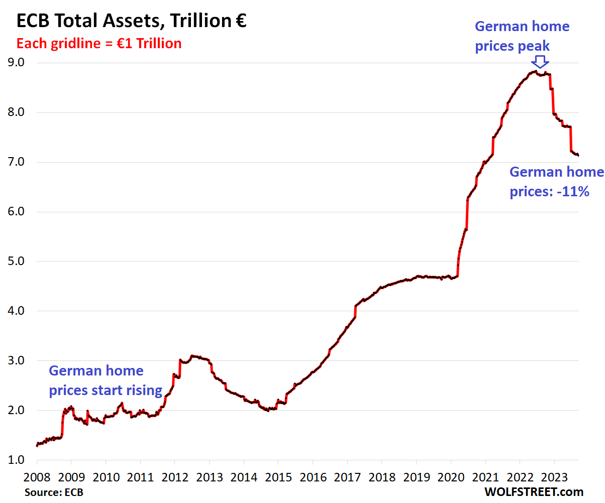 The QT show started less than a year ago. German home prices -11%, ECB assets -19%.