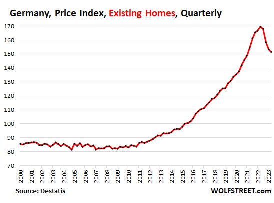 Prices dropped the most in Germany’s largest metro areas – Berlin, Hamburg, Munich, Cologne, Frankfurt, Stuttgart, und Düsseldorf – with prices of condos dropping 9.8% and prices of single-family houses and duplexes dropping 12.6% year-over-year. In less densely populated areas, prices also fell, but not as much, according to Destatis.
