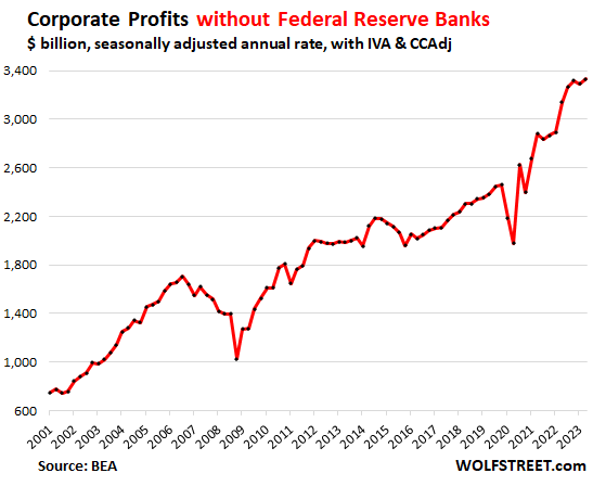 1. What the heck is the Fed doing in here? Well… The 12 regional Federal Reserve Banks, on whose financial statements the Fed’s profits are accounted for, are private corporations and are therefore included in the headline figures for corporate profits by the Bureau of Economic Analysis. The Fed has been losing large amounts of money by paying out more in interest to banks and money market funds than it earns in interest on its still vast but shrinking portfolio of securities. But in terms of profits from current production by US businesses, the Fed’s profits or losses are irrelevant. So I exclude them here (and I rail about them there).