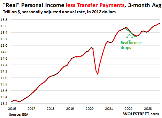 The income from all sources but without transfer payments from the government (so minus Social Security benefits, unemployment insurance, VA benefits, etc.) has been outrunning inflation for months, after a steep setback last year. So this is income from wages and salaries, interest, dividends, rental property, and personal business, but without transfer payments.