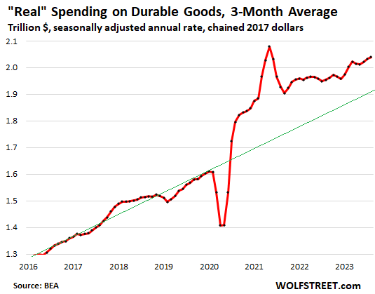The pandemic spike of spending on durable goods, adjusted for inflation, still hasn’t returned to trend, and in fact seems to run permanently higher compared to pre-pandemic trend, which is another indication that our Drunken Sailors like their stuff and don’t just quit buying it because economists said they would.