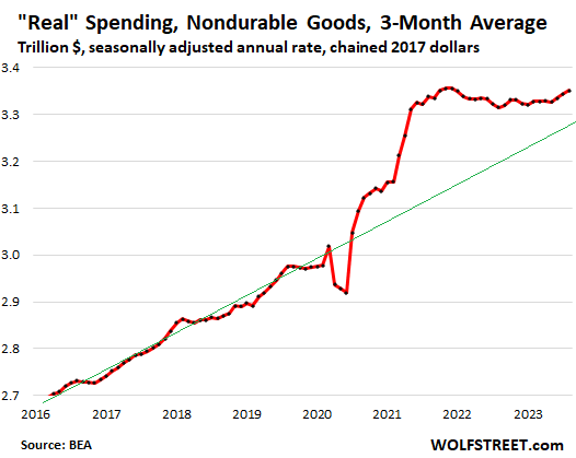 “Real” spending on nondurable goods (adjusted for inflation) dipped by 0.1% for the month. The three-month average rose by 0.2%. Year-over-year, it rose by 1.1%. Nondurable goods include food, fuel, clothes, shoes, and supplies.