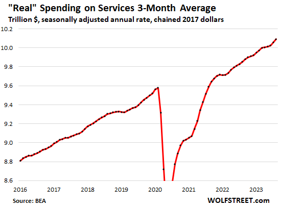 This inflation-adjusted growth of spending on services is astonishing because it’s in services where inflation is still red hot: Core services inflation rose by 5.1% in August, according to the PCE price index.
