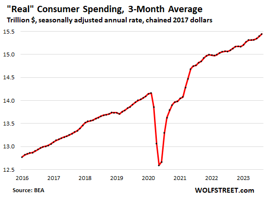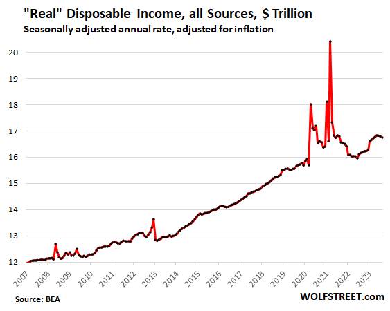 But in the first half of 2022, consumers’ real income dropped sharply for six months on the surge of inflation, and when real income began to rise, it took another six months to get back where they’d been at the beginning of 2022, and then languished there for months. In April 2023, real income finally started setting records again and has continued to do so every month since then.