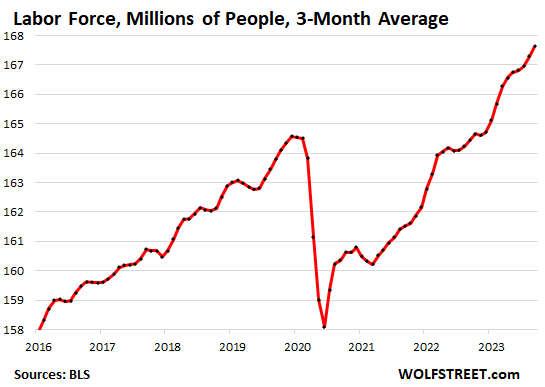As you’d expect from an economy that is plugging along just fine, the number of jobs created in the prior two months was revised up by 198,000, for a change, after a long series of downward revisions. And in September 336,000 jobs were created, per the survey of employers by the Bureau of Labor Statistics today.