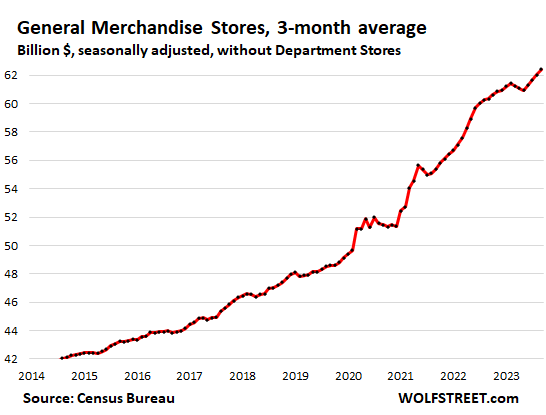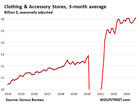 Compared to a year ago, retail sales rose 3.8%, seasonally adjusted. Our beloved drunken sailors, as we’ve come to call them because they just refuse to slow down, went on another buying binge at retailers, fired up by the biggest income increases in decades.