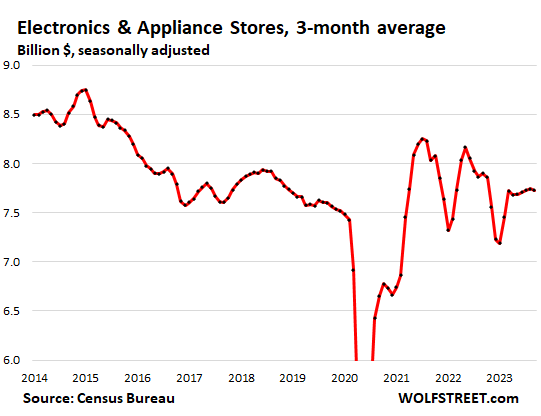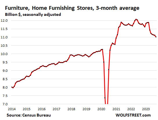 Furniture and home furnishing stores (1.6% of total retail). A big portion of furniture and furnishing sales have wandered off to the internet, with huge online retailers, such as Wayfair, dominating the scene. This is what’s left over at brick-and-mortar retailers that specialize in furniture and furnishings:
