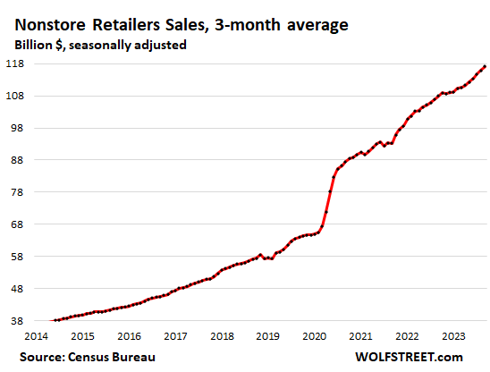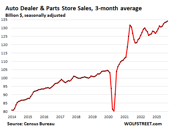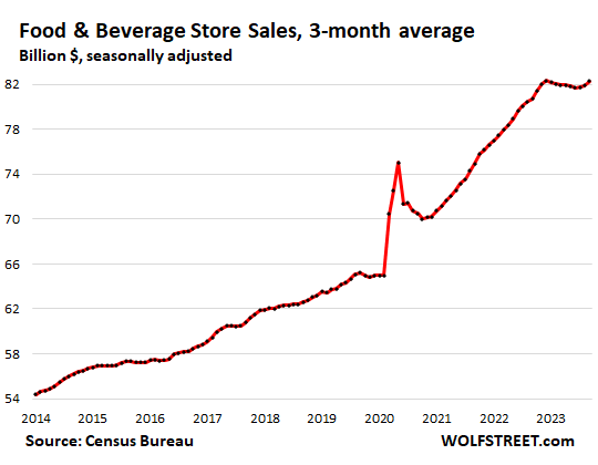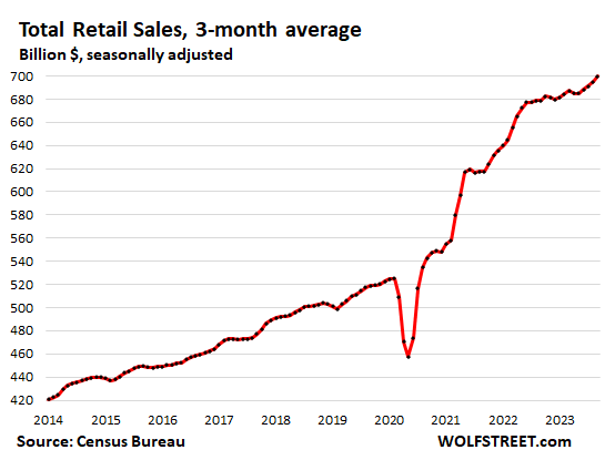 Total retail sales, including at bars and restaurants, jumped 0.7% in September, after the upwardly revised 0.8% jump in August, and the 0.6% jump in July. Over the past three months annualized, retail sales jumped by 8.7%, a sharp acceleration from late last year and earlier this year.