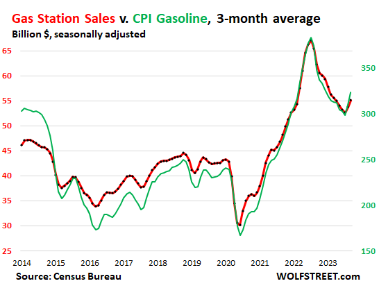 This chart shows the CPI for gasoline (green, right axis) and sales in billions of dollars at gas stations, including other merchandise that gas stations sell (red, left axis):