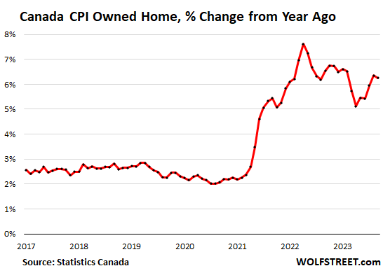 Year-over-year, the CPI for homeownership or “owned accommodation” eased a tad to 6.3% in September from 6.4% in the prior month, which had been the highest since February.