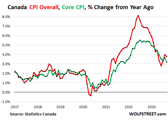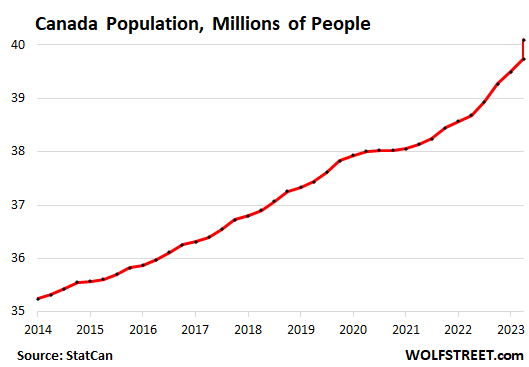 The population of Canada increased by 1.16 million people over the past four quarters, or by 2.1%, to 40.1 million in Q3, according to Statistics Canada. This was between two and five times the growth rate in prior years. In addition to whatever other issues this sudden surge in population poses, it turns the rental-housing market into an inflation hotbed. Note the spike in the population in the quarter:
