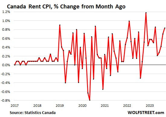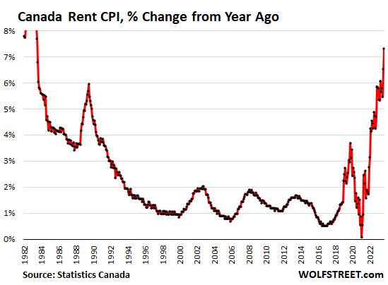 The scary part about inflation in Canada is the red-hot rent inflation, which has shot up in nearly a straight line to 7.3% in September year-over-year, the highest rate since July 1983 when it was on the way down, according to Statistics Canada today. This rent inflation is a huge problem for Canadians.