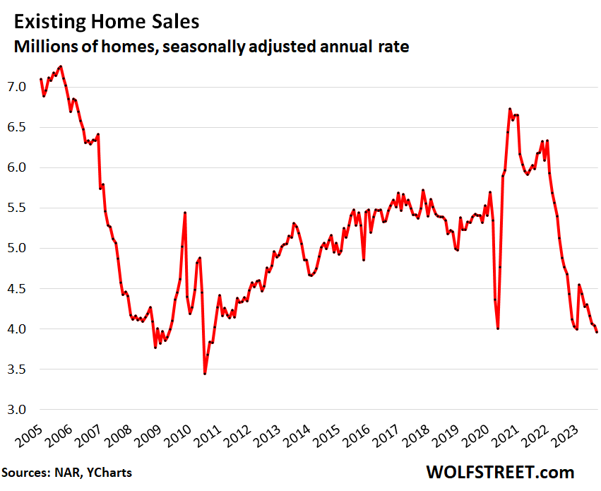 Sales of previously owned houses, condos, and co-ops crashed to a seasonally adjusted annual rate of 3.96 million homes in September, the lowest since the depth of the housing bust in 2010. Compared to the Septembers in prior years (historic data via YCharts):