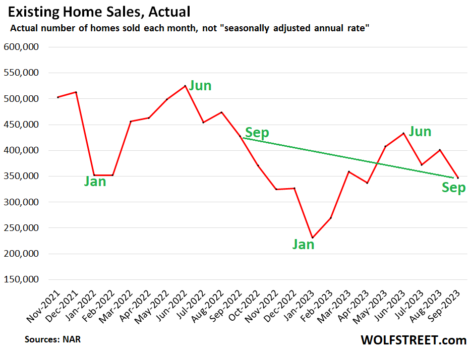 Actual sales – not seasonally adjusted annual rate – fell 18.9% from the already depressed levels in September 2022 to 347,000 homes.