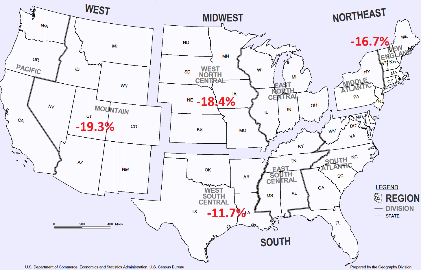 By region, sales plunged in all regions from the already beaten-down levels last year: