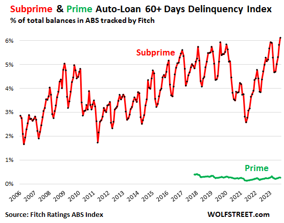 This chart shows the 60-plus days delinquency rates based on the ABS tracked by Fitch Ratings of subprime-rated borrowers (red) going back to 2006, and prime-rated borrowers going back to September 2017 (green). Remember: only 14% of all outstanding auto-loan balances are subprime, 86% are prime: