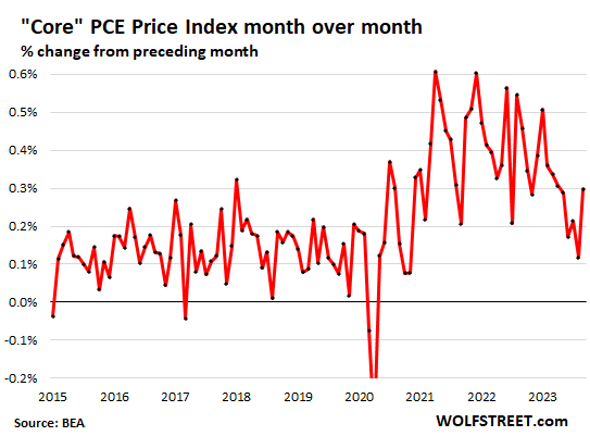 The spike in inflation in “core services” (all services except energy services) was the big nasty surprise – inflation is infamous for dishing up nasty surprises – in today’s release of the PCE price index for September. “Core services” is the index that Fed chair Jerome Powell has been hammering on, especially “core services without housing” because housing inflation is already coming down, and it’s just lagging etc., etc., and so the other core services were in his focus because their inflation rates sort of refused to come down.