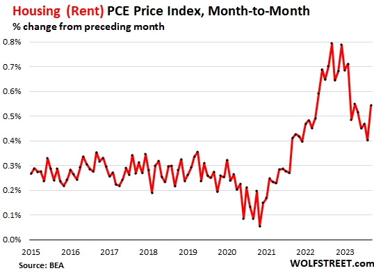 The PCE price index for housing, which is composed of various rent factors, spiked by 0.54% in September from August (6.7% annualized).