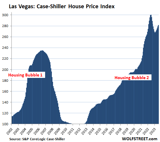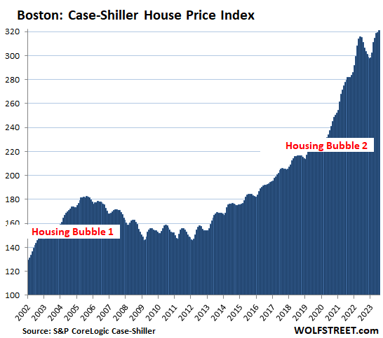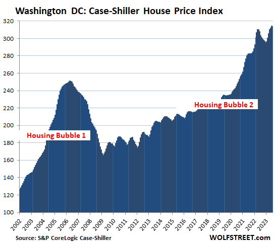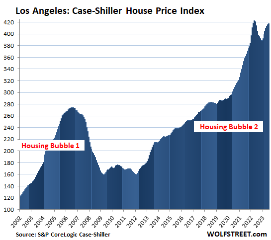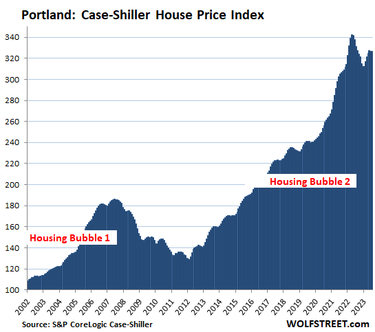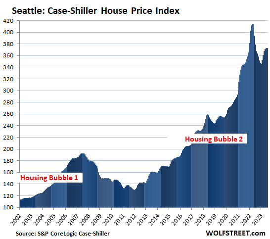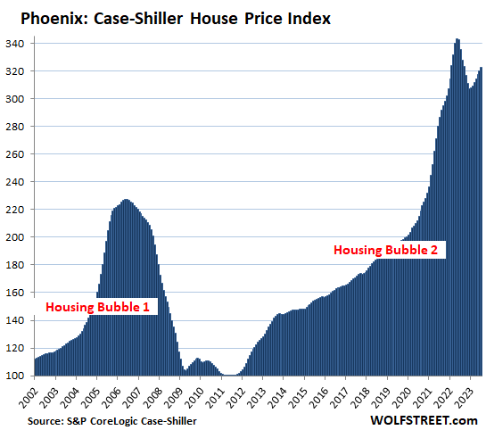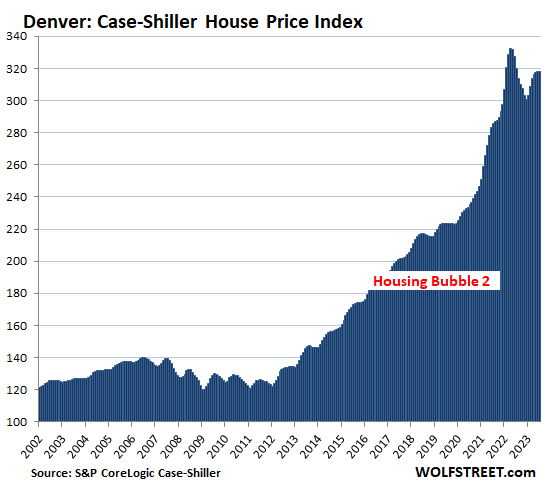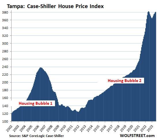 The remaining 6 of the 20 markets in the Case-Shiller index (Chicago, Charlotte, Minneapolis, Atlanta, Detroit, and Cleveland) had far less house price inflation since 2000, and don’t qualify for this list of the Most Splendid Housing Bubbles. But in 2022 and 2023, these metros were the ones with the biggest home price increases in percentage terms even as prices have fallen or flattened out in the expensive markets.