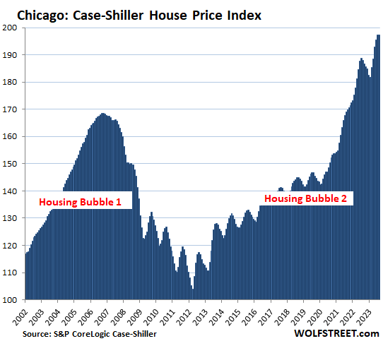 The Chicago metro doesn’t qualify for this list, with an index value of 197, which is up by “only” 97% from 2000, and 93 points below the lowest-ranked metro of the Most Splendid Housing Bubbles, New York (index value = 290). But here it is anyway: