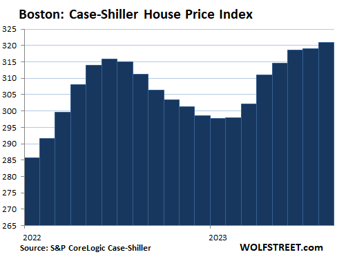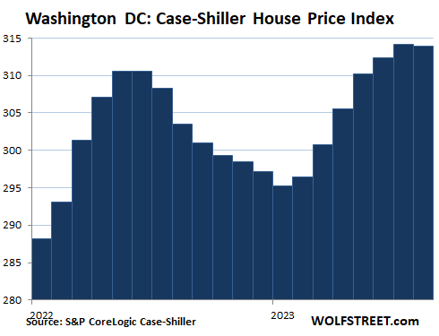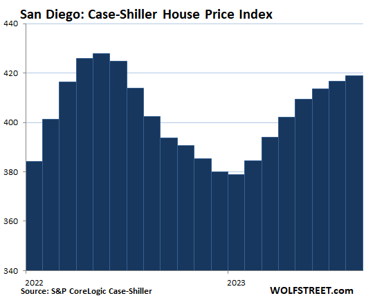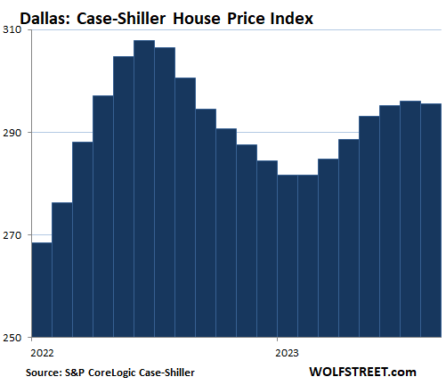 The remaining 6 of the 20 markets in the Case-Shiller index (Chicago, Charlotte, Minneapolis, Atlanta, Detroit, and Cleveland) had far less house price inflation since 2000, and don’t qualify for this list of the Most Splendid Housing Bubbles. But in 2022 and 2023, these metros were the ones with the biggest home price increases in percentage terms even as prices have fallen or flattened out in the expensive markets.