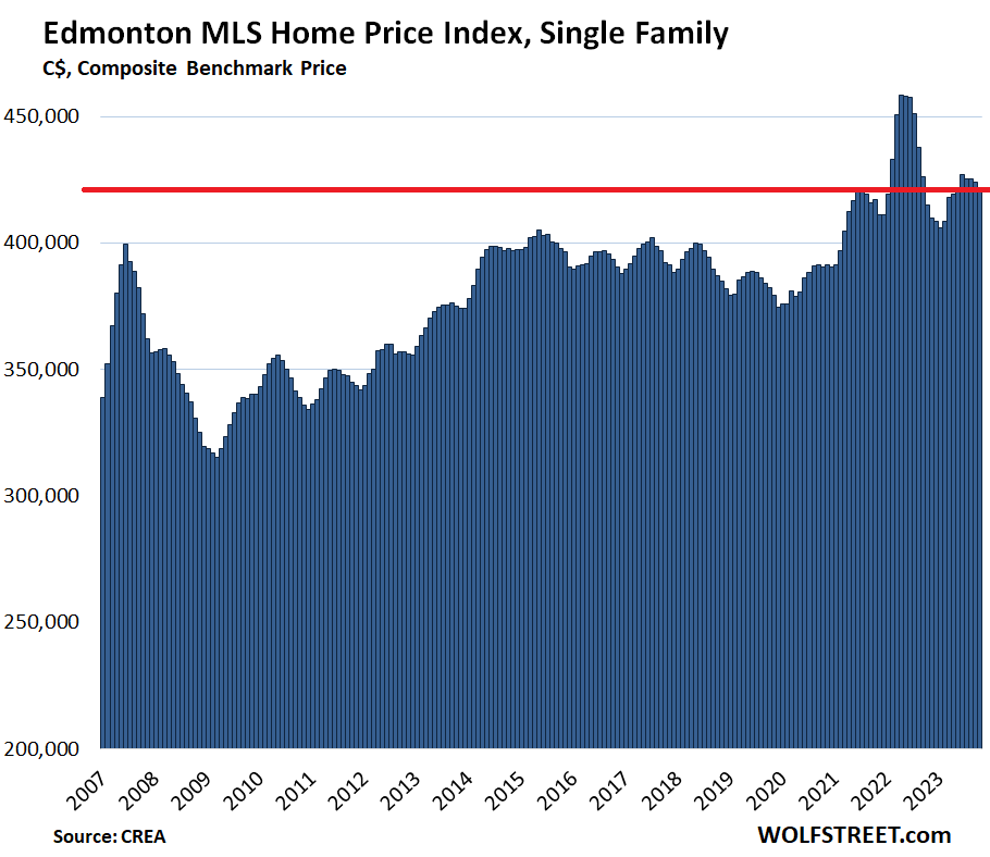 From peak in March 2022, prices fell 15.6%, in Toronto 17.2%. But Calgary reached a new high (still waiting for the memo?).
