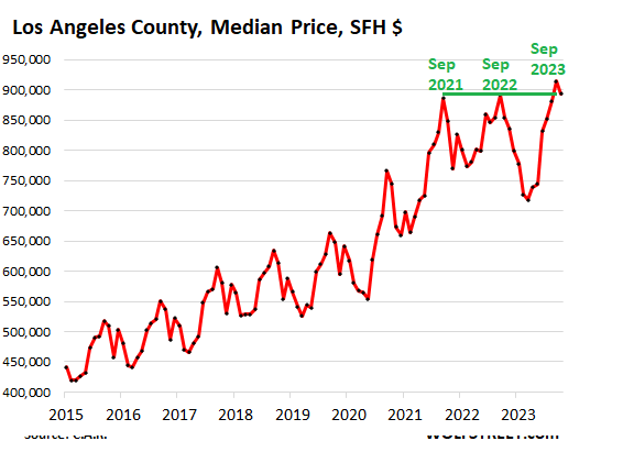 Generally, there is an uptick or flat-spot in October from September that might also reach November. This year, the price fell in October from September. But last year, prices just kept plunging, which was very unusual, following the pandemic pattern of normal seasonality going out the window. Due to the steep plunge in prices last year in July through December, the median price was up year-over-year by 3.4%.