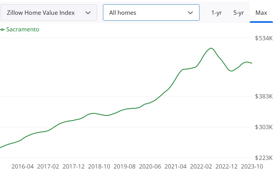 I’m really tired of your manipulative BS. Once a month at a housing article, you show up and drag out the same BS about the “hot” housing market in your area, which, as you said before, is Sacramento; and every time you post this BS, I post an updated Zillow chart of Sacramento, and you vanish for another month until you resurge from the ashes yet again with more BS. So here is yet another updated Zillow chart of the median home price in your area: