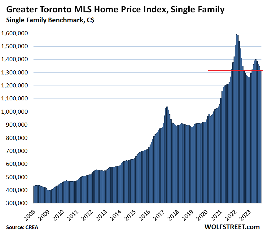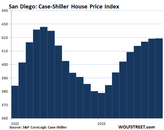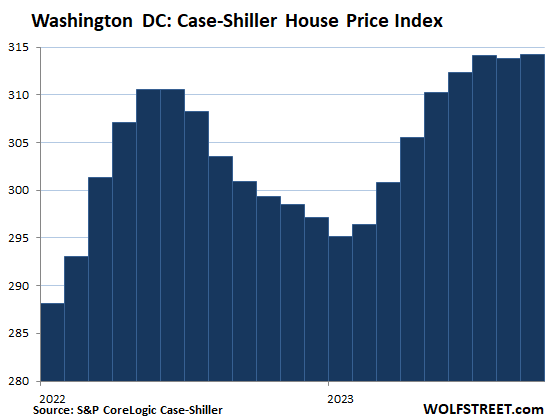 The remaining 6 of the 20 markets in the Case-Shiller index (Chicago, Charlotte, Minneapolis, Atlanta, Detroit, and Cleveland) had far less home price inflation than 180% since 2000, and don’t qualify for this list of the Most Splendid Housing Bubbles. But in 2022 and 2023, these metros were the ones with the biggest home price increases in percentage terms.