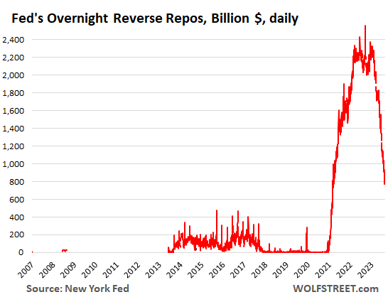 Treasury notes (2- to 10-year securities) and bonds (20- & 30-year securities) “roll off” the balance sheet mid-month or at the end of the month when they mature and the Fed gets paid face value for them. The roll-off is capped at $60 billion per month, and about that much has been rolling off, minus the inflation protection the Fed earns on Treasury Inflation Protected Securities (TIPS) which is added to the principal of the TIPS.