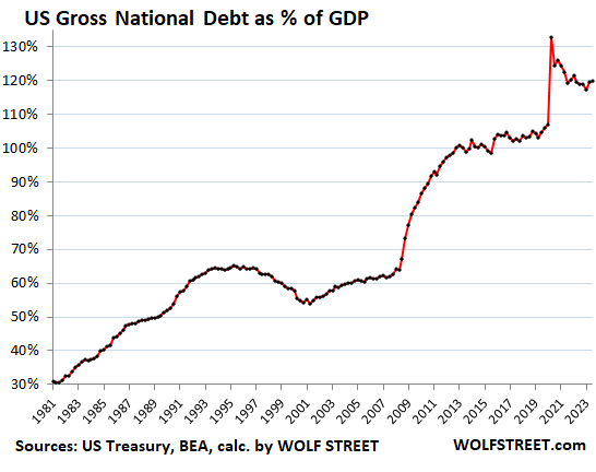 But in Q3, nominal GDP grew by 2.1% from the prior quarter (not annualized, not adjusted for inflation), while the debt grew by 3.5% over the same period (also not annualized, not adjusted for inflation). And so the burden of the debt grew. A similar thing happened in Q2.