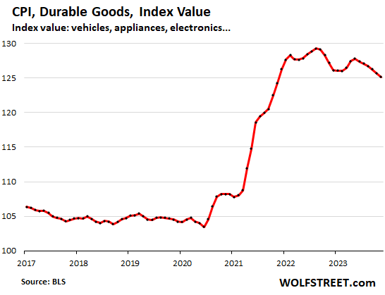 Durable goods prices spiked ridiculously during the pandemic due to shortages and transportation chaos. Used car prices for example spiked by about 60% in a little over a year, which is totally ridiculous. Now they’re coming off those ridiculous levels. Used car prices have dropped about 12% or so.