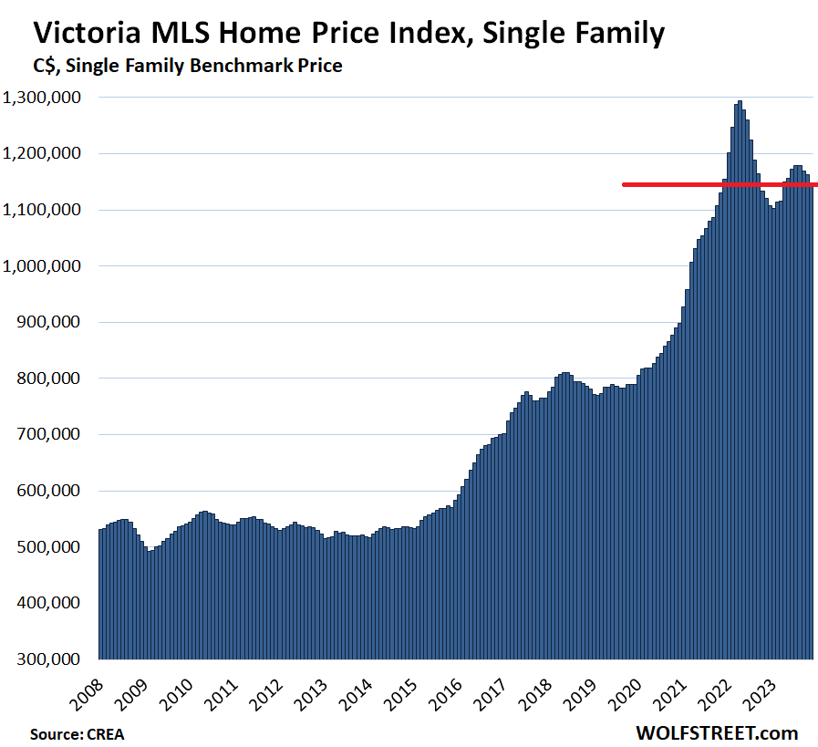 Prices of new homes – new single-family houses, duplexes, and condos – dropped by 0.6% in the quarter, and by 4.5% year-over-year from Q3 2022, which was also the peak. The index has now unwound nearly all of the gains since Q2 2021. Between 2010 and the peak in 2022, prices had spiked by 80%.
