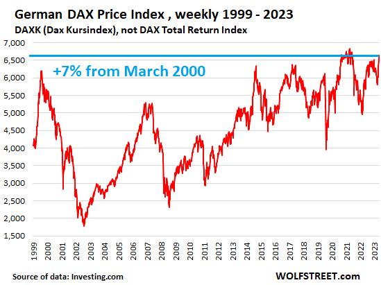 And it’s up by only 7% from the high in March 2000 – which was over 23 years ago. And it’s among the lucky European stock indices. Many of them have not returned to their all-time highs around 2000 or 2007. The big Japanese and Chinese indices are also way below their all-time highs.
