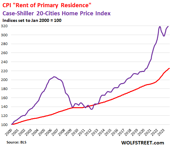 It shows the reality of QE: Interest rate repression through policy rates (short term rates) and QE (longer-term rates) causes rampant home price inflation; and with higher rates and with QT, the equation reverts and home prices tank.