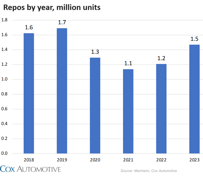 What idiotic YouTuber bullshit, every single word of it ? Here are annual repos, just ticking up from the free-money lows and not even back to the Good Times levels before the pandemic (Cox Automotive):