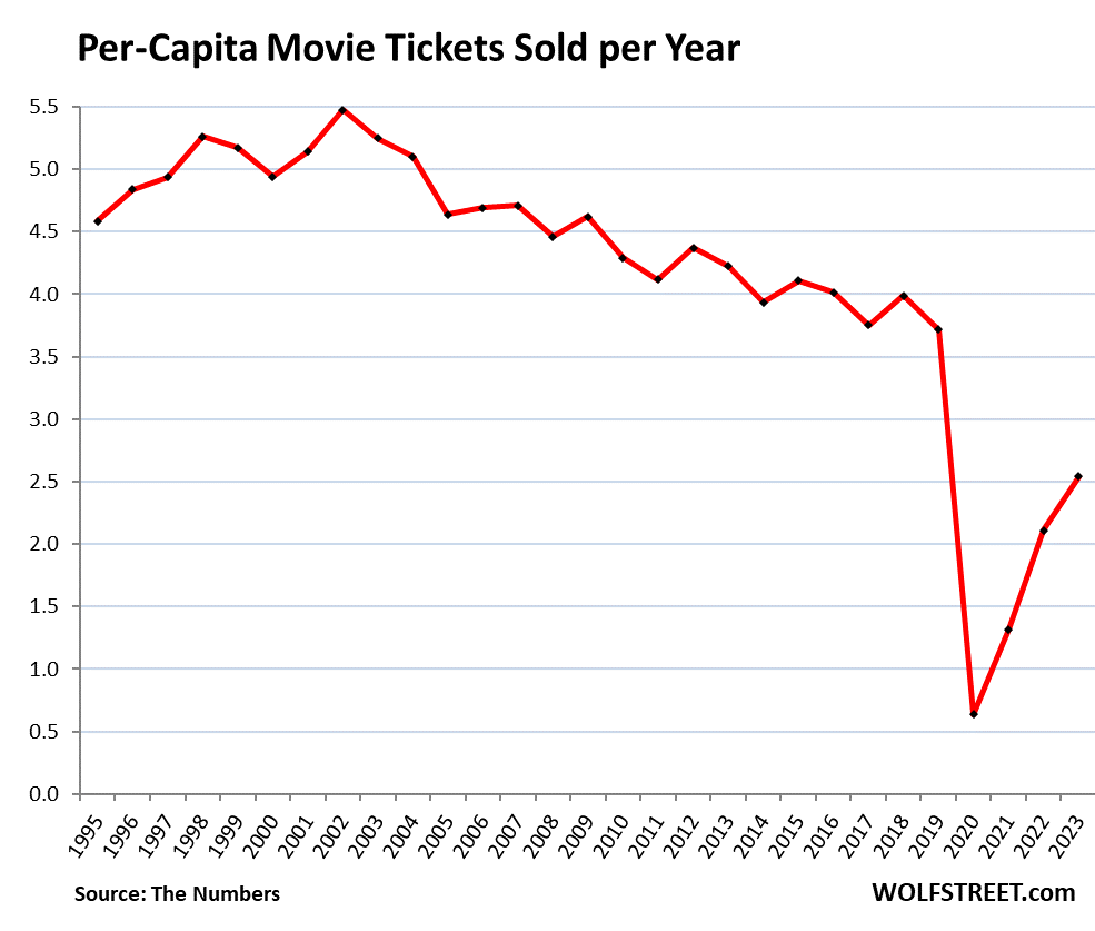“On a per-capita basis, ticket sales plunged by 54% in 21 years, from an average of 5.5 tickets per person per year in 2002, to just 2.5 tickets per person per year in 2023:”
