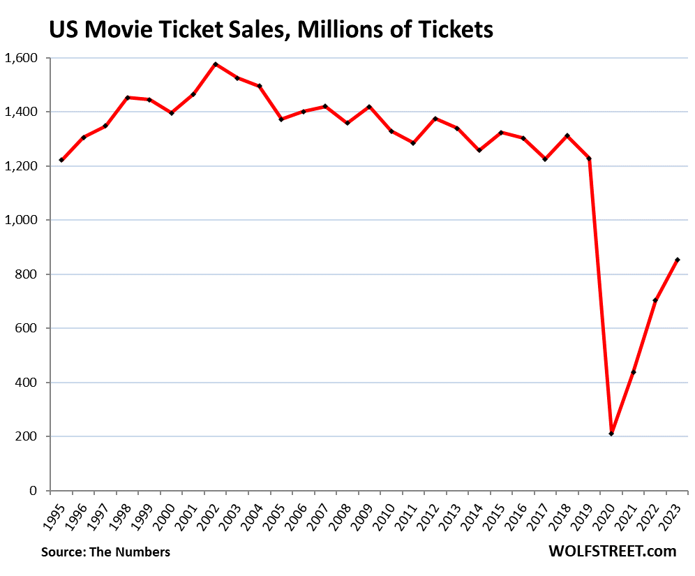 Only 852 million movie tickets were sold in 2023, down by 46% from the peak year 2002 (1.85 billion tickets), so that was 21 years ago, and down by 31% from 2019 (1.23 billion tickets), despite the one-weekend wonder in July of “Barbenheimer” – the simultaneous theatrical release of Barbie and Oppenheimer.