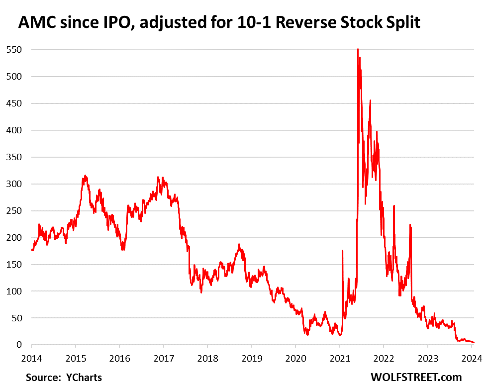And the stock [AMC] keeps collapsing. It has long been enshrined in our pantheon of Imploded Stocks. Today, AMC’s shares dipped to $4.48, down by 99.4% from its meme-stock peak in June 2021, and down by 97% from its reverse-stock-split-adjusted IPO price (data via YCharts):