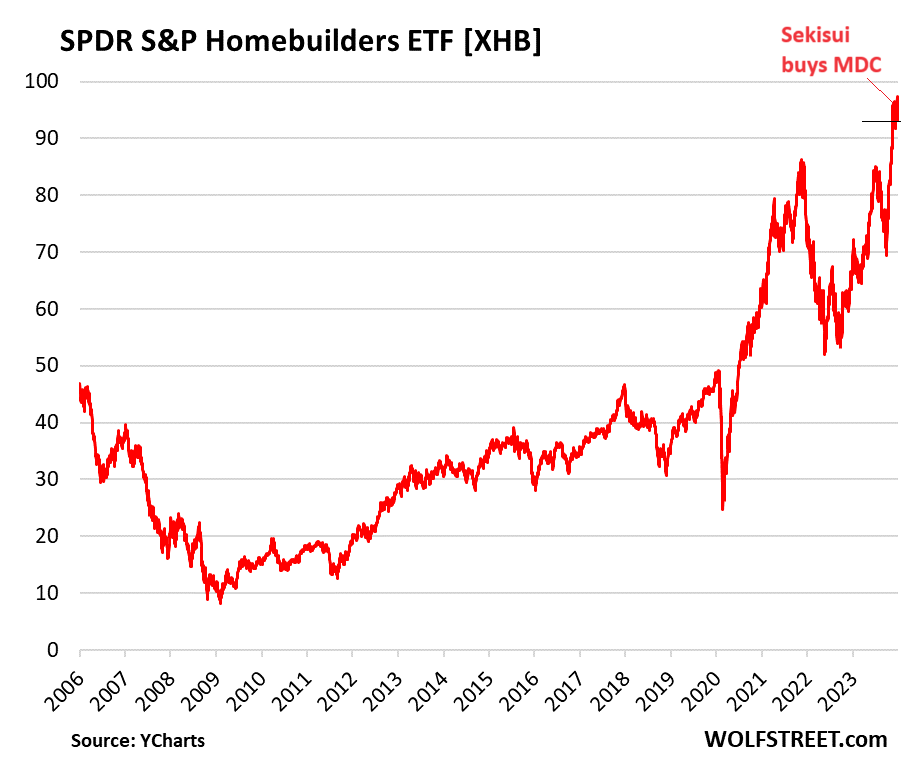 With buyers stretched by sky-high prices and mortgage rates that have doubled over the past two years, and with builders having to offer smaller and lower-priced homes and having to buy down mortgage rates aggressively at a substantial cost to keep sales from collapsing, as they have already collapsed for existing homes, while their stocks are perched at all-time highs, it’s now a perfect time for Sekisui House to buy a big US homebuilder, no?